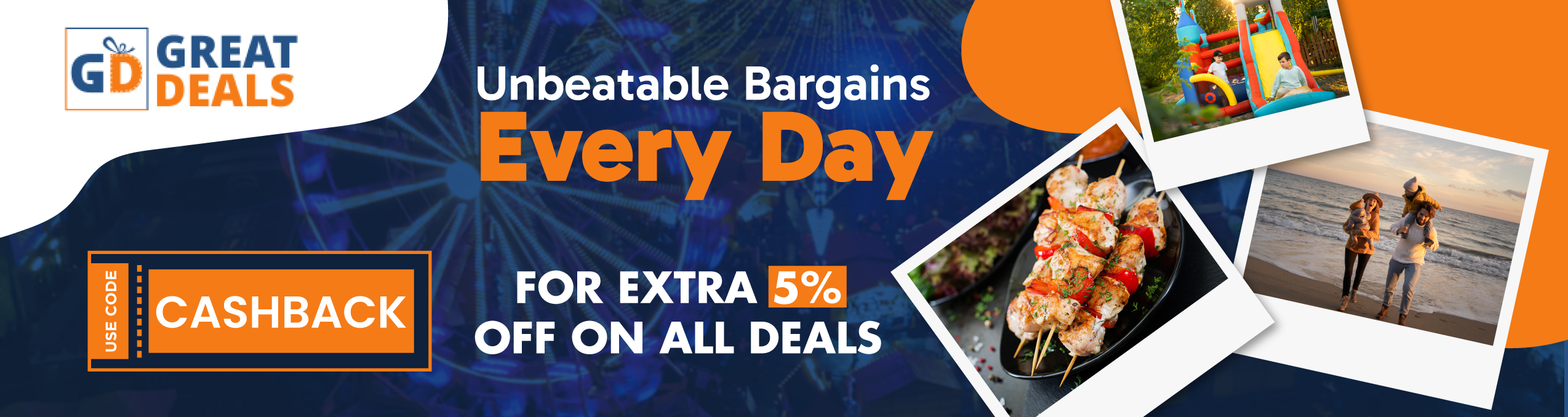 80% Off CodeSave Up to 80% + Extra 5% Off on All DealsEnsure your holidays at the best of destinations with an exclusive offer from Great Deals UAE. Discover exciting Theme Parks, impressive Food, luxury yet quirky Staycations, and a whole lot more. Apply Great Deals coupon code on checkout to avail discounts and rebates.