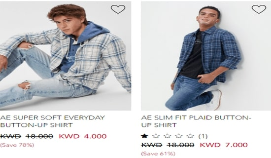 Show Details75% Off Men’sAmerican Eagle Cashback Offer: Save Up to 75% + Extra 8% Off on Men’s ClothesAmerican Eagle Kuwait has got an amazing collection of Men's clothes. Browse the entire collection of products and select your favorite from T-shirts, polo, pants and more. Order now and avail the opportunity to get discounts along with cash back at the checkout.