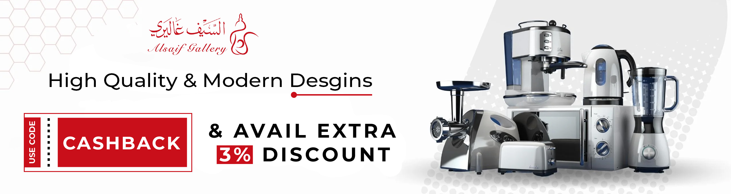 Show Details50% Off AppliancesAl Saif Gallery Discount Code: Save Up to 50% + Extra 3% Off on Electrical AppliancesGet your brand-new, genuine electrical equipment from the Al Saif Gallery Oman at low prices. By using the Al Saif Gallery coupon code at checkout, you can choose your preferred pressure cookers, mixers, blenders, juicers, Coffee Machines, Electric Kettles, Heater, and much more, and receive amazing savings and cash back on your purchase.