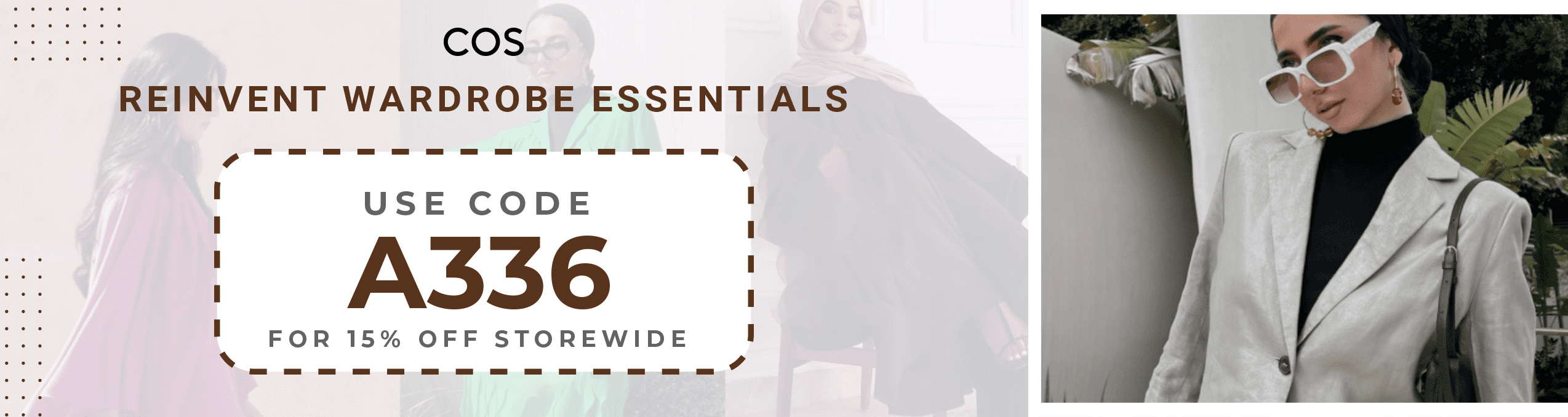 Show Details75% Off AccessoriesCOS Code KSA: Save Up to 75% + Extra 15% Off on Full Price AccessoriesShop trendy fashion accessories in KSA at insanely low prices using COS promotion code. Choose latest hat, scarves & gloves, glasses, and many more for Men and Women via COS store. Go to COS UAE, add items in the basket, and avail voucher code at the checkout to get discount and cashback.