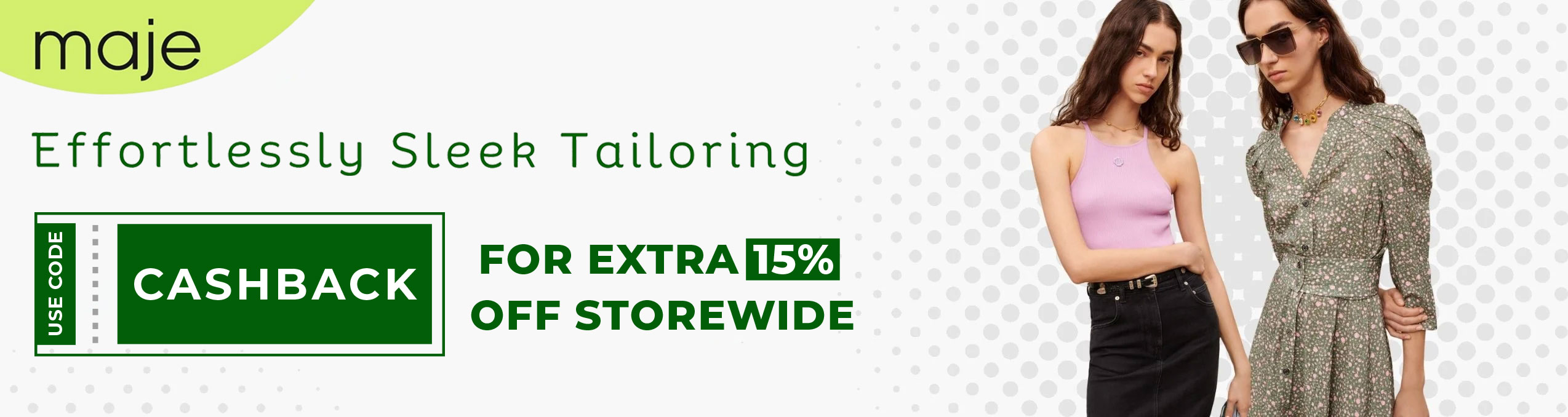 Show DetailsNew Customer CodeNew Customer Exclusive: Flat 15% Off on First OrderMaje has brought amazing deals and discounts for all of its new customers in UAE. Select your desired from Dresses, Bags, Shoes, Accessories and much more, and get huge discounts with cash back on your order by simply using the Maje first order promo at the time of checkout.